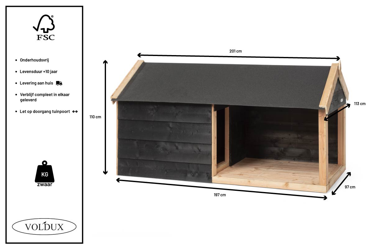 Dit hondenhok met veranda heeft een (buiten) afmeting van 201 x 107 x 110 cm