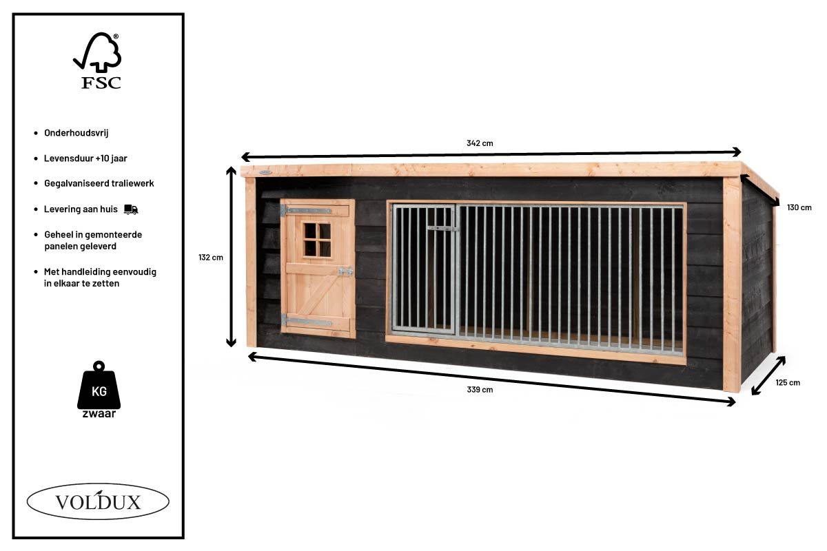 Dit hondenhok met nachthok én kennel heeft een (buiten) afmeting van 342 x 130 x 132 cm