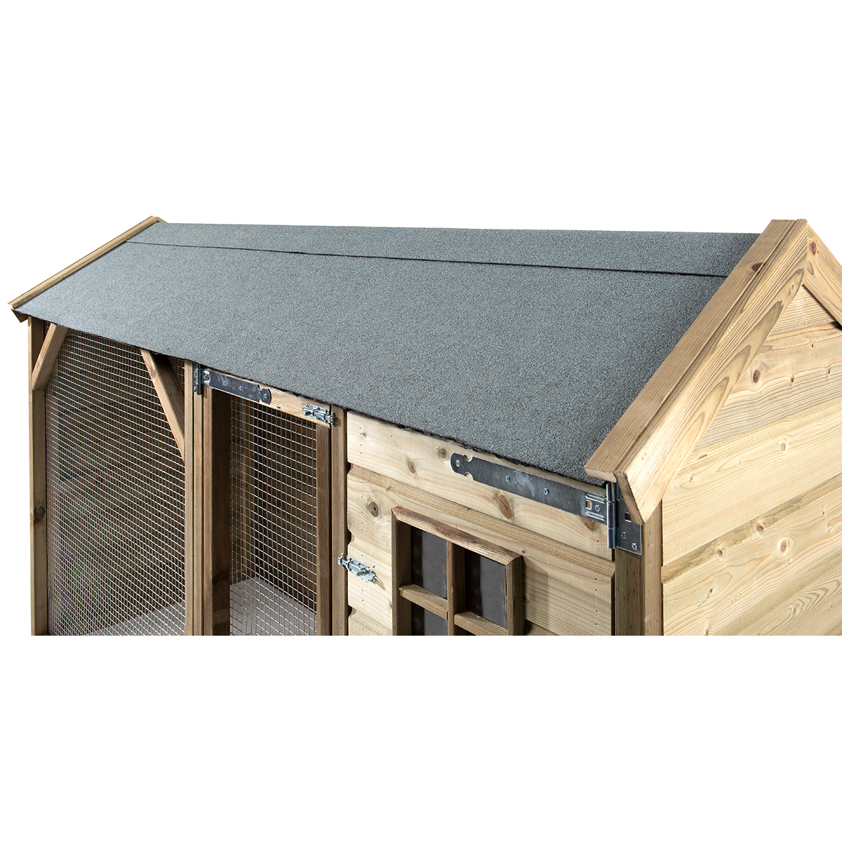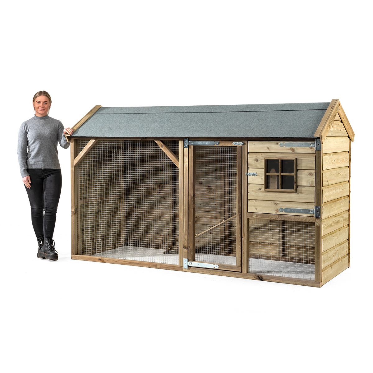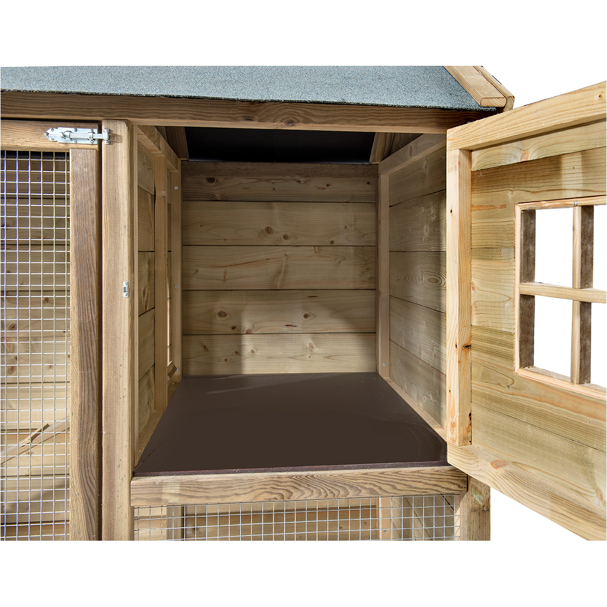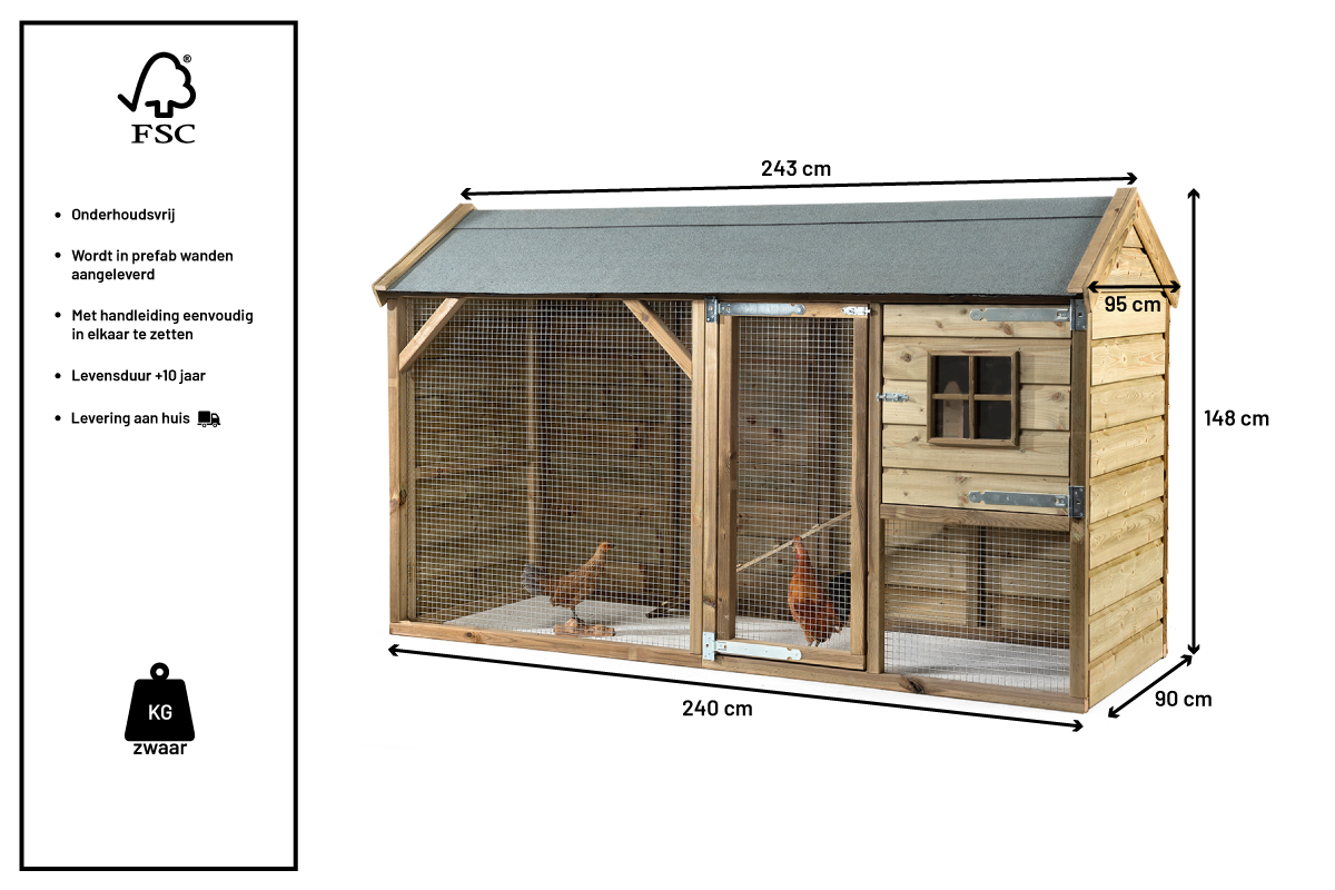 Gemaakt van geïmpregneerd grenenhout en voorzien van betonplex bodemplaat in het nachthok