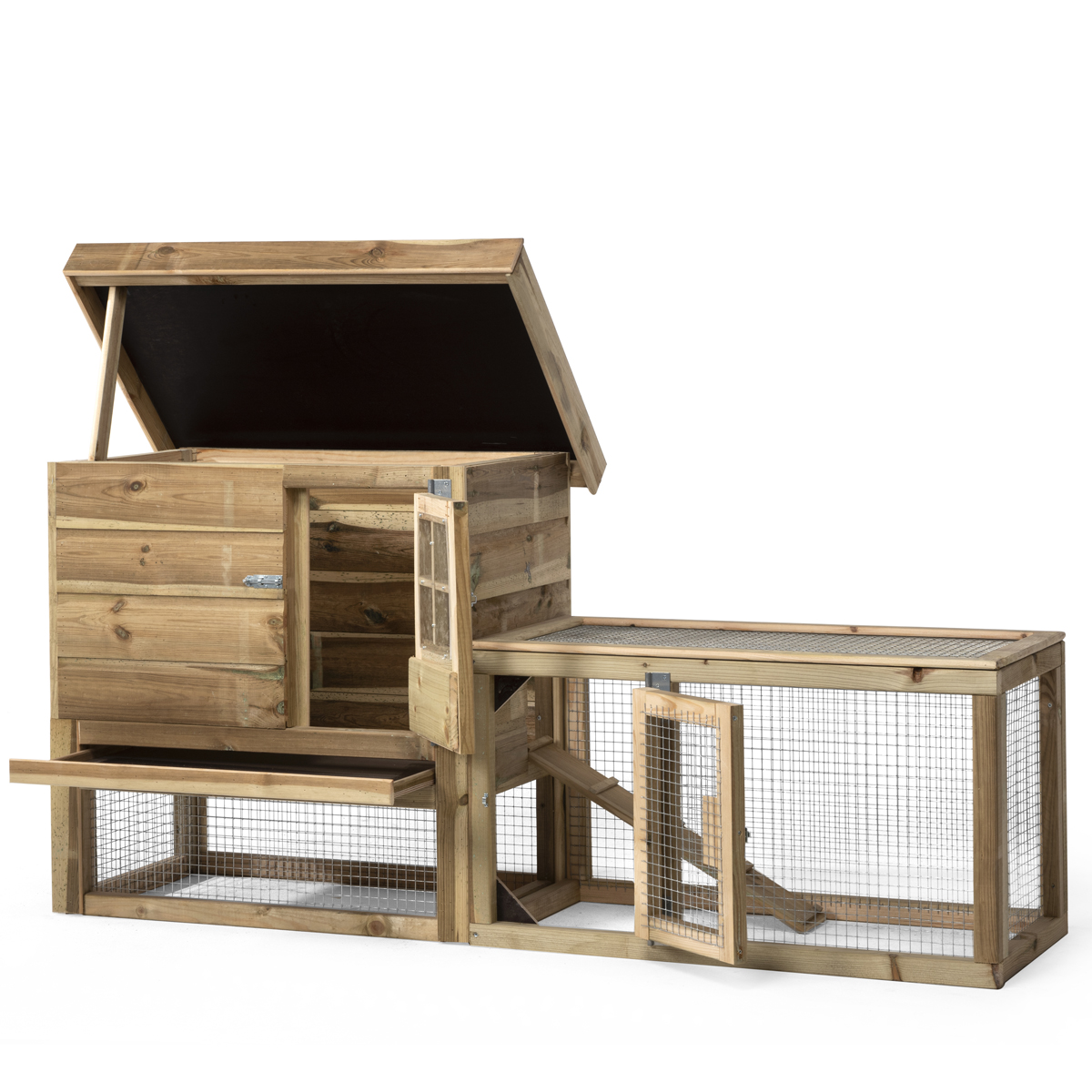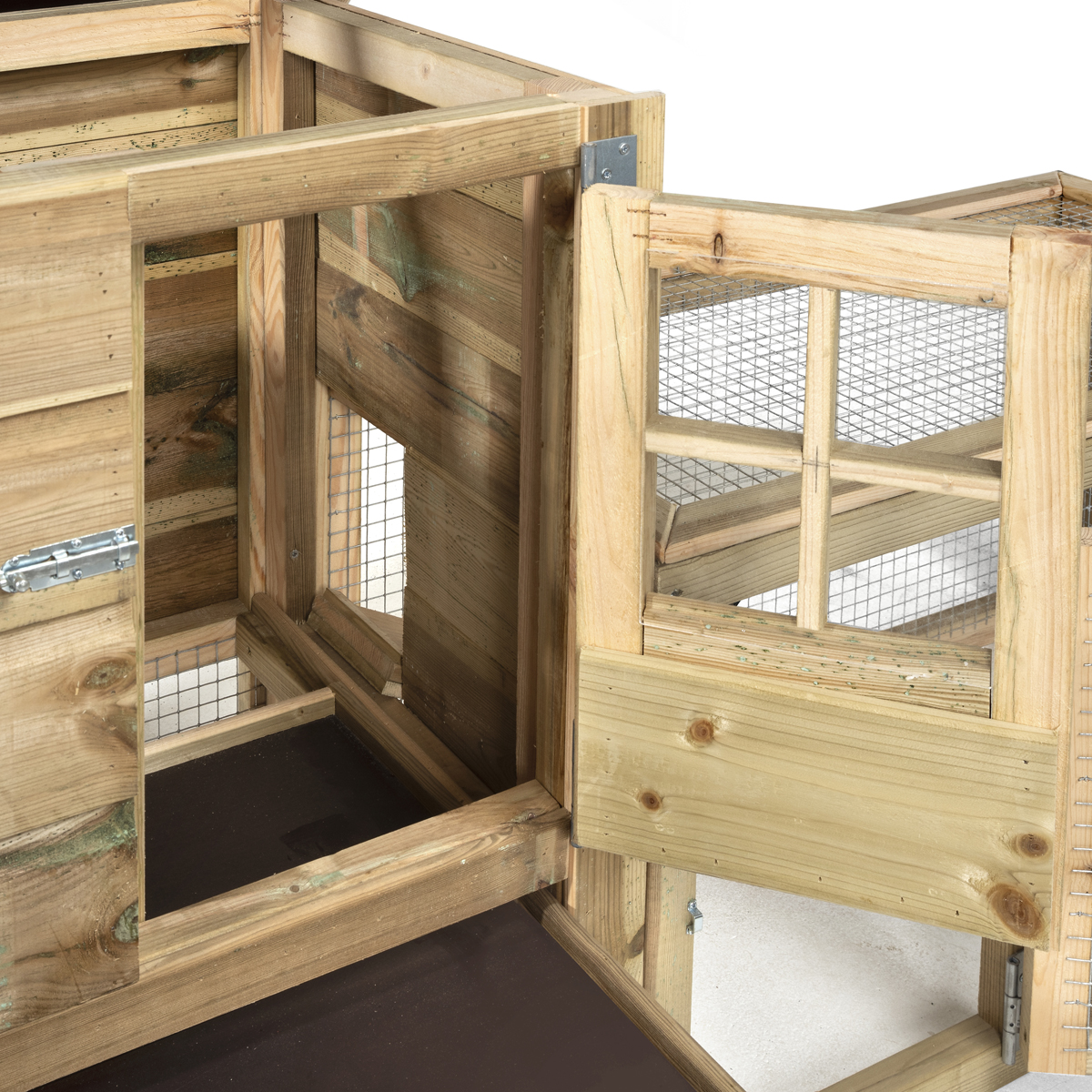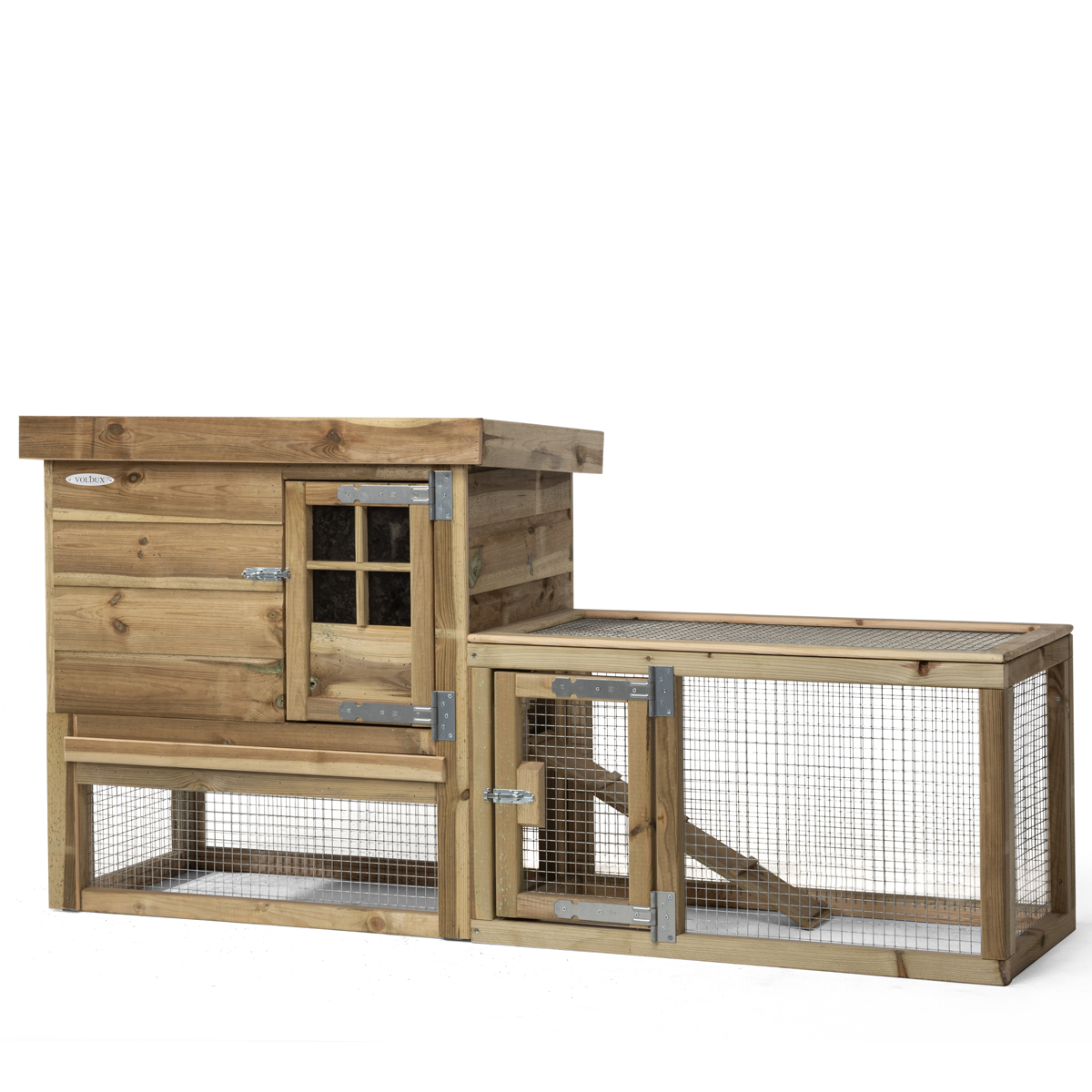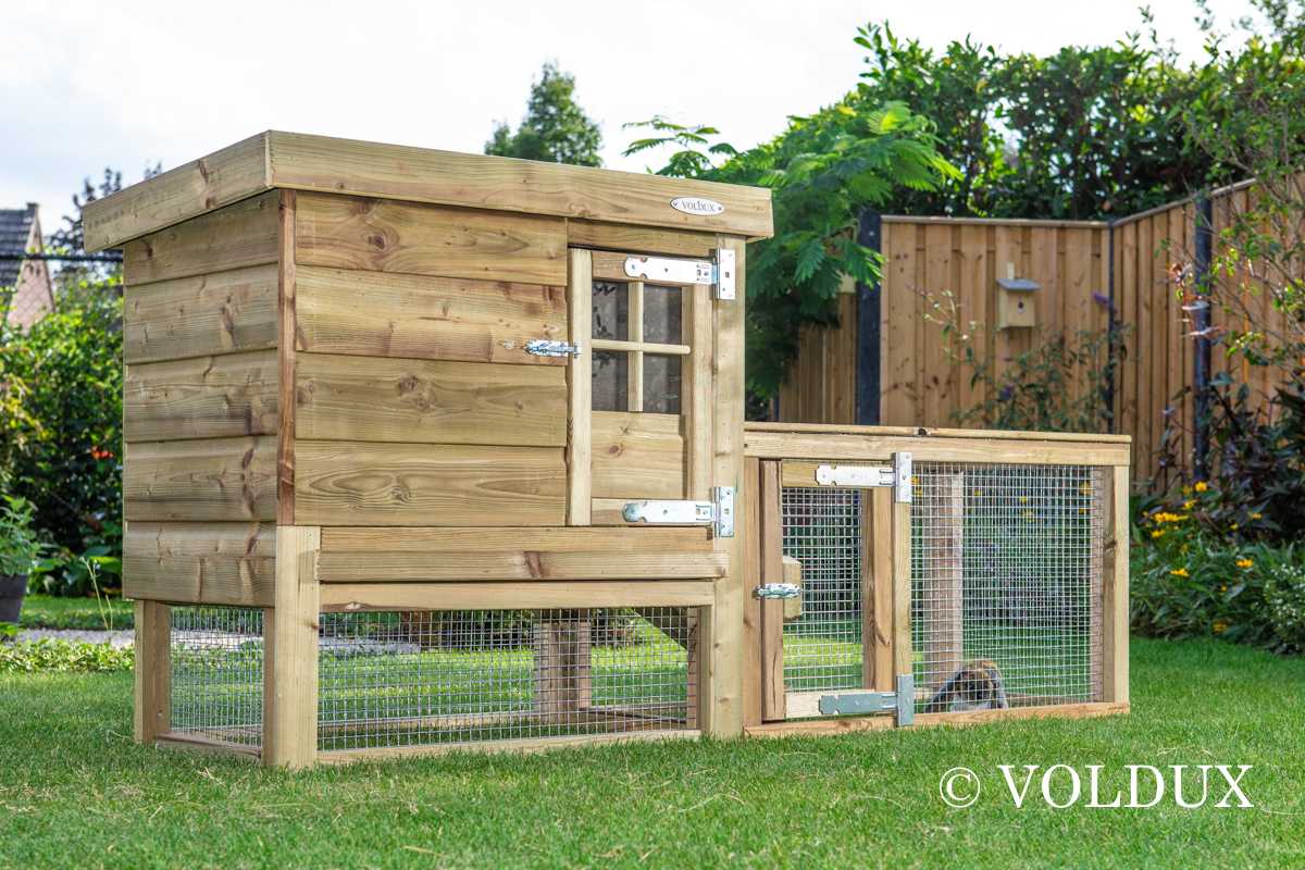 Dit konijnenhok is gemaakt van geimpregneerd hout en is hierdoor onderhoudsvrij