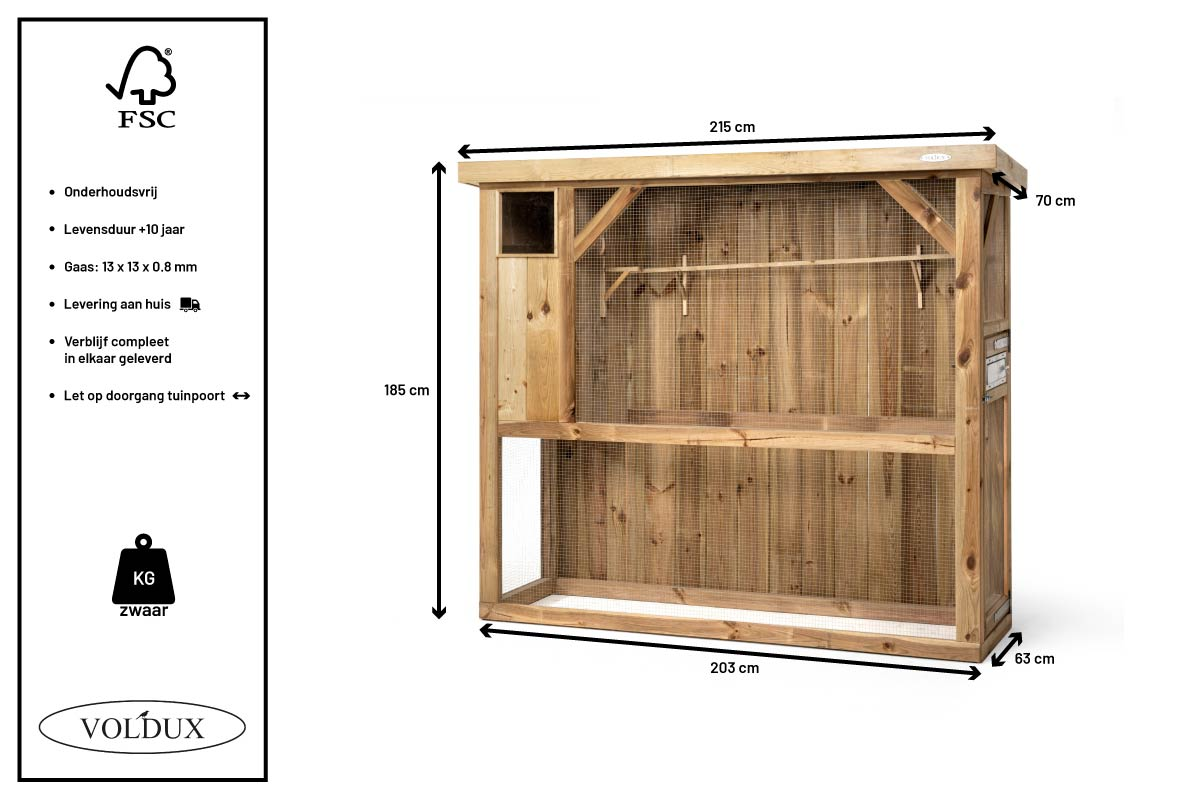 Het vogelverblijf heeft een afmeting van 215 x 70 x 185 cm