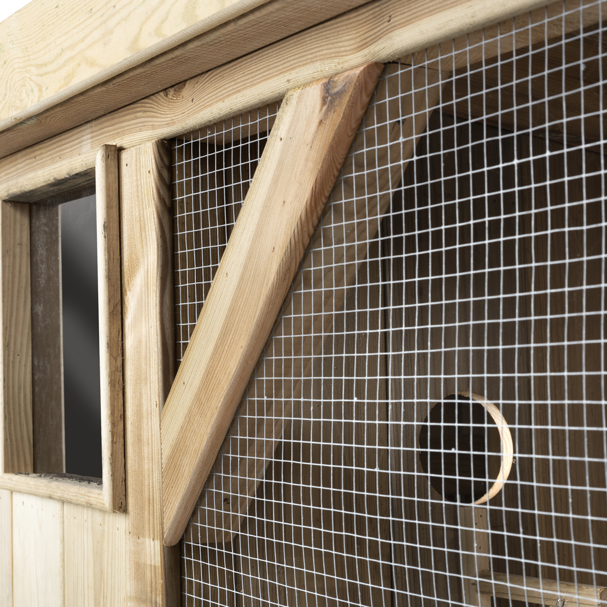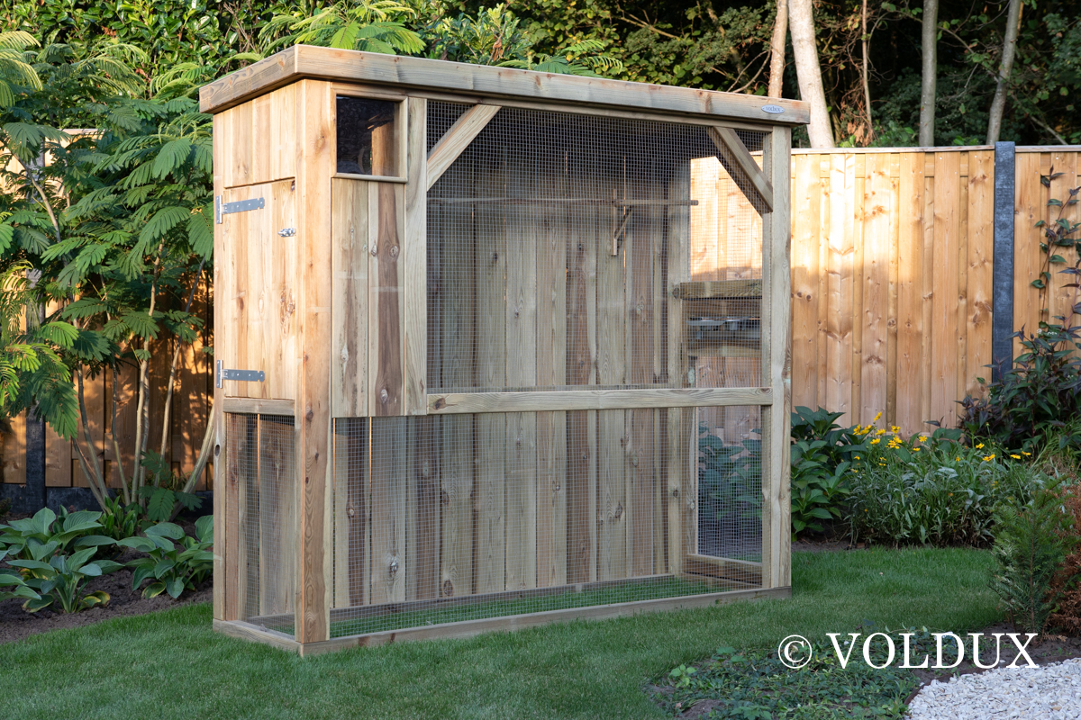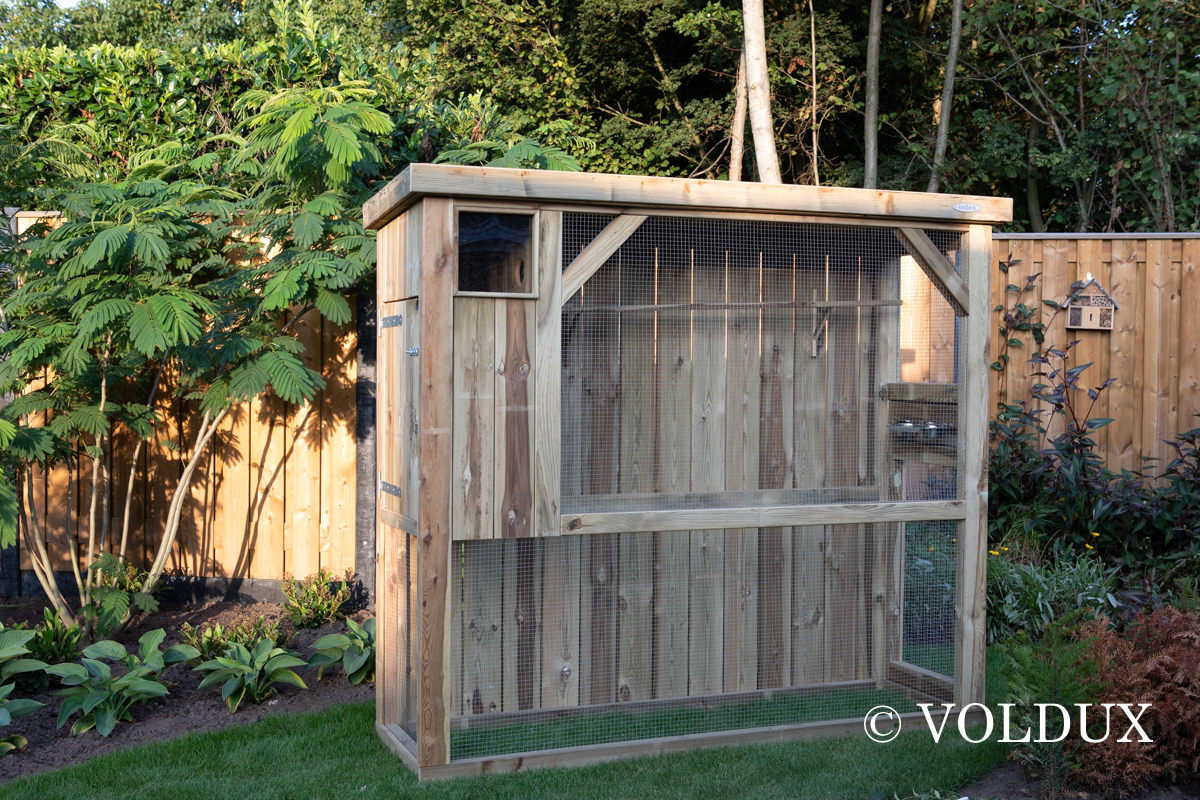 Deze voliere is gemaakt van onderhoudsvrij geïmpregneerd hout
