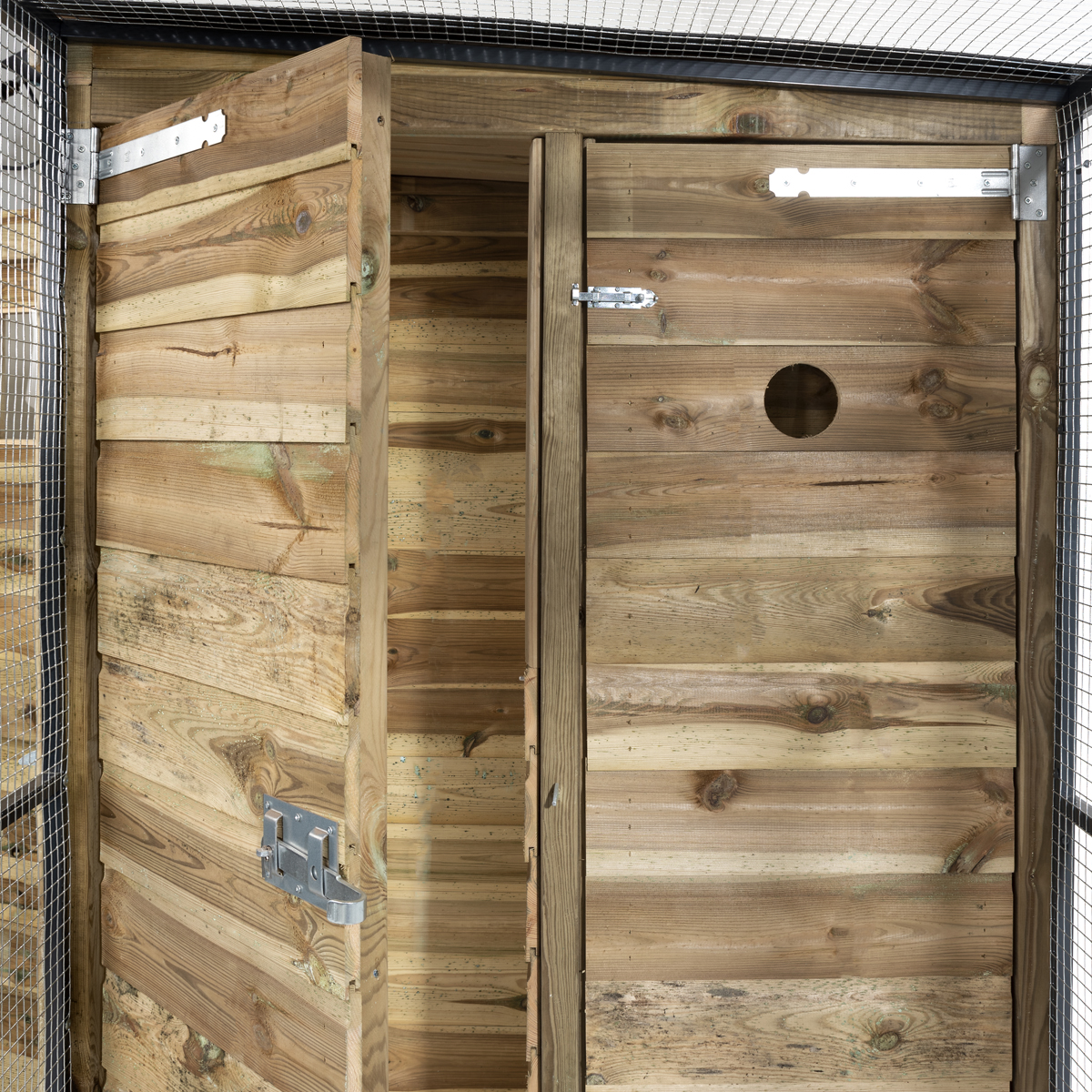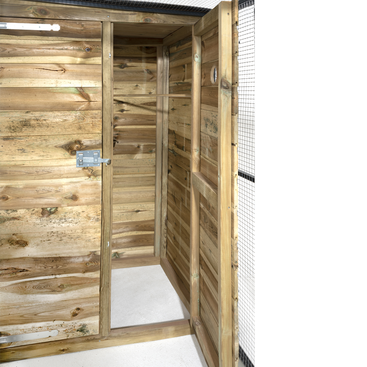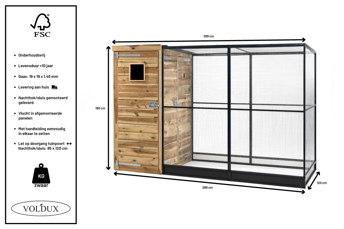 Hoogwaardige aluminium volière van 289 x 220 x 190 cm met nachthok van behandeld hout
