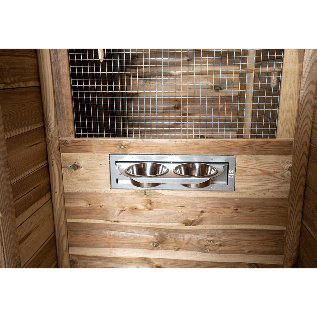 De voliere is voorzien van een draaibaar 2 baks voedersysteem
