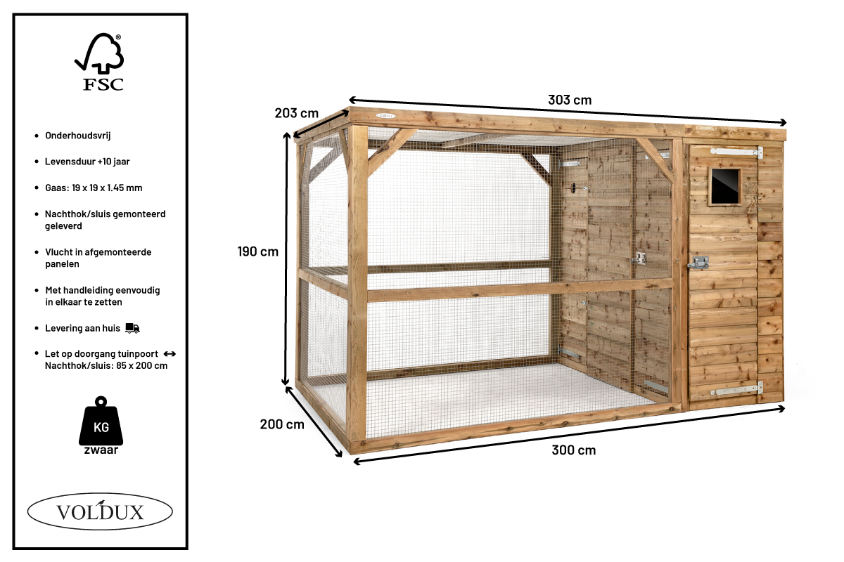 Grote vogelvoliere met ruime vlucht en houten nachthok